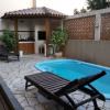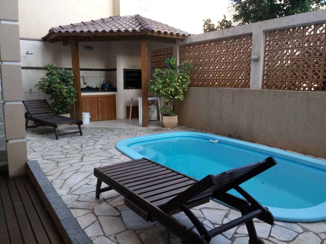 área externa com deck na área de piscina e quiosque com churrasqueira.