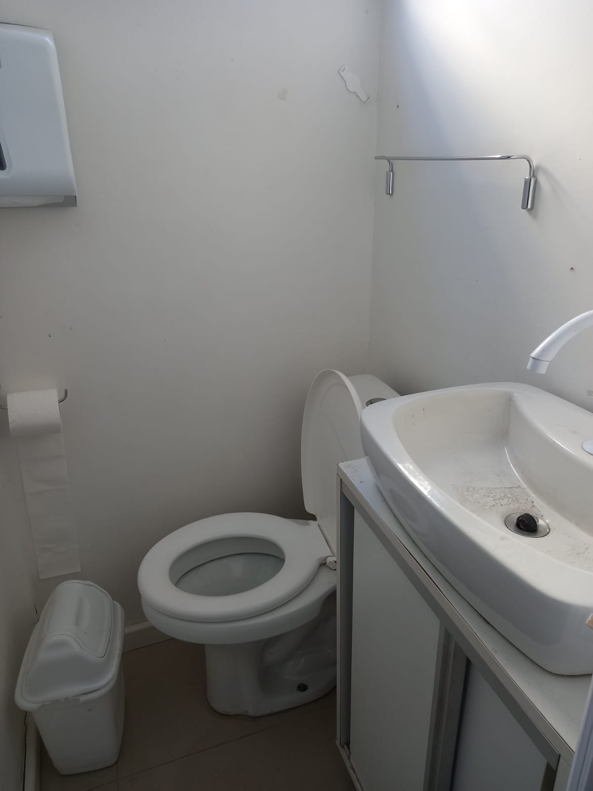 Banheiro com box de vidro. Sala ampla e iluminada.